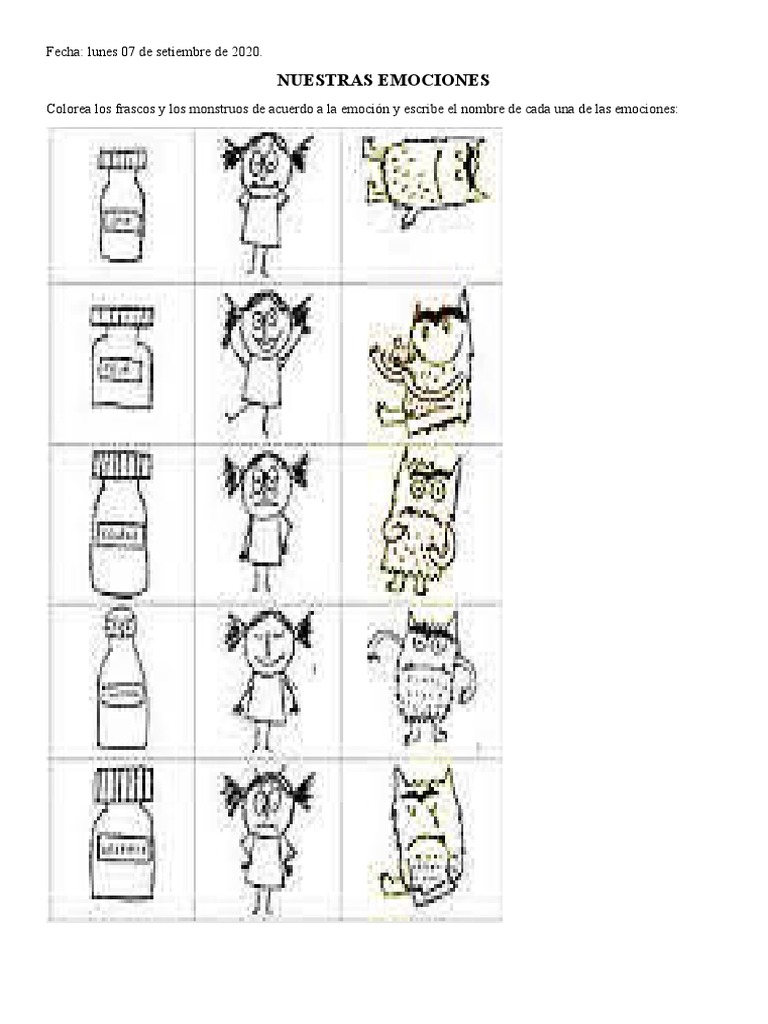 Colorea los frascos y los monstruos de acuerdo a la emoción y escribe el nombre de cada una de las emociones: