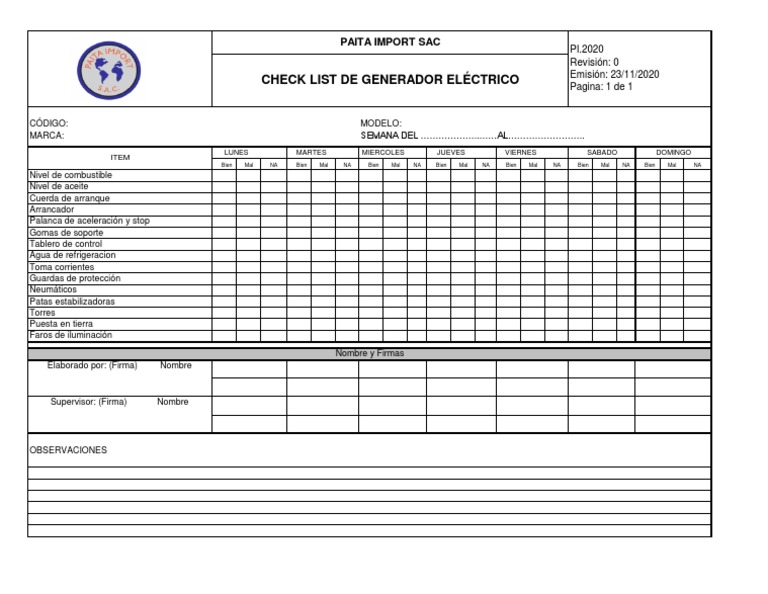 CHECK LIST DE GENERADOR ELÉCTRICO Pagina: 1 de 1