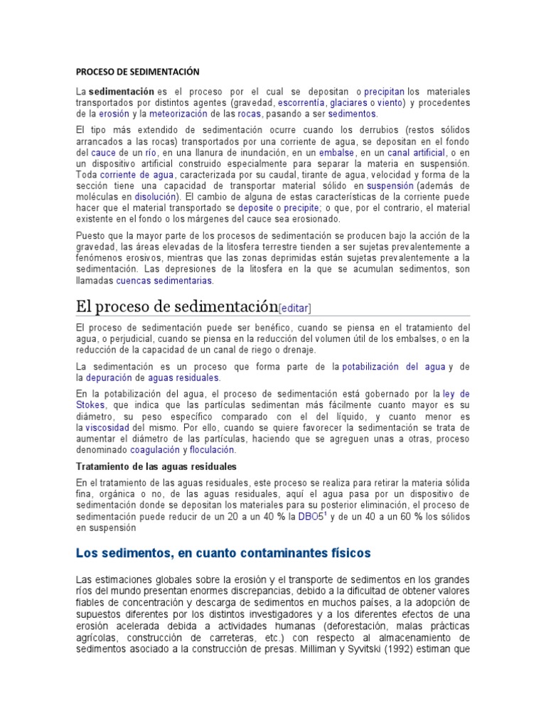 La sedimentación es el proceso por el cual se depositan o precipitan los materiales