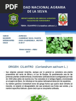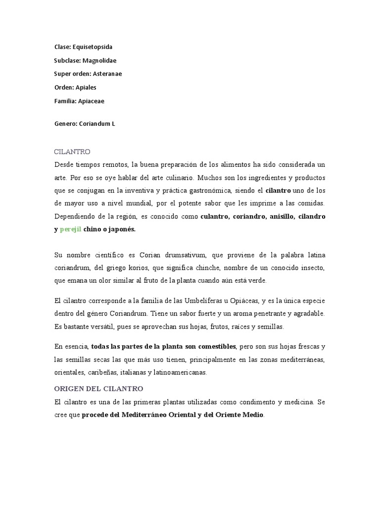 El cilantro corresponde a la familia de las Umbelíferas u Opiáceas, y es la única especie