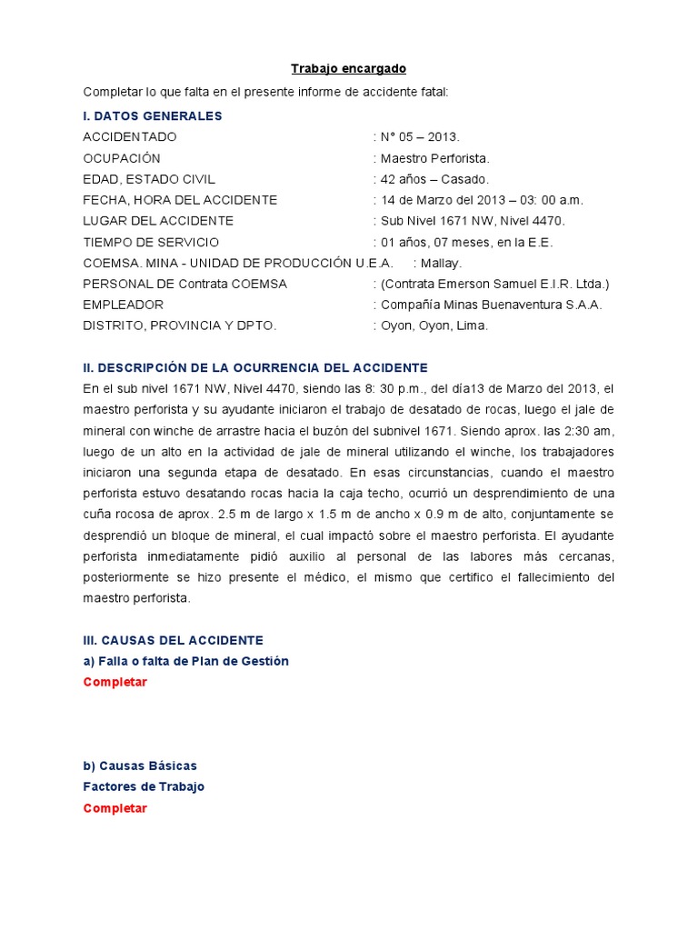 LUGAR DEL ACCIDENTE : Sub Nivel 1671 NW, Nivel 4470.
