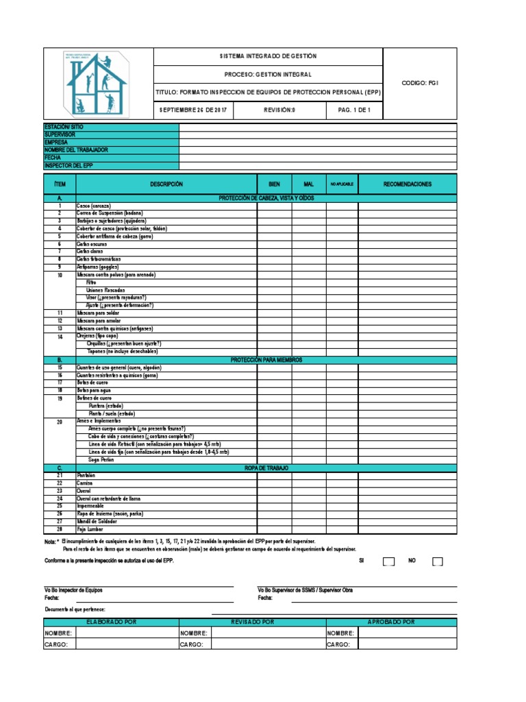 TITULO: FORMATO INSPECCION DE EQUIPOS DE PROTECCION PERSONAL (EPP)