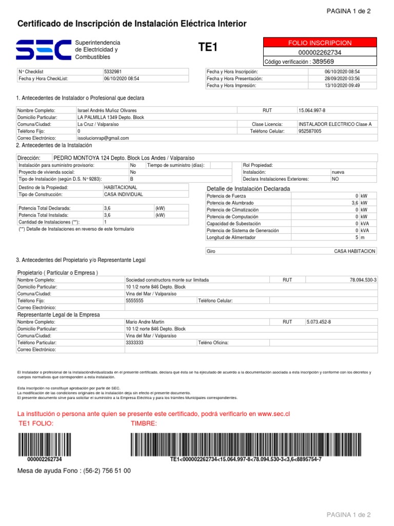 Certificado de Inscripción de Instalación Eléctrica Interior
