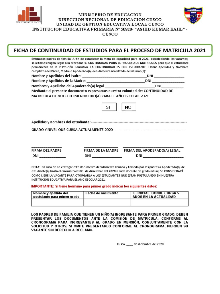 FICHA DE CONTINUIDAD DE ESTUDIOS PARA EL PROCESO DE MATRICULA 2021