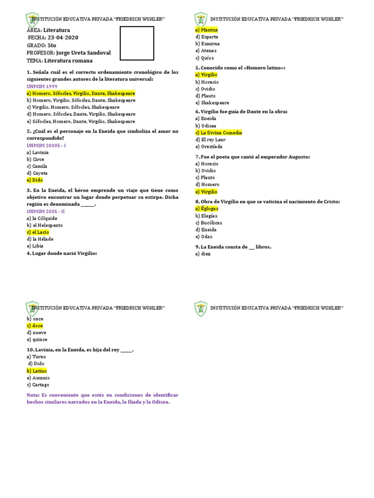 d) Homero, Só focles, Dante, Virgilio, Shakespeare 6. Virgilio fue guía de Dante en la obra: