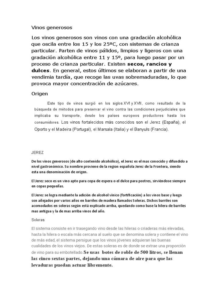 De los vinos generosos (de alto contenido alcohólico), el Jerez es el mas conocido y difundido a