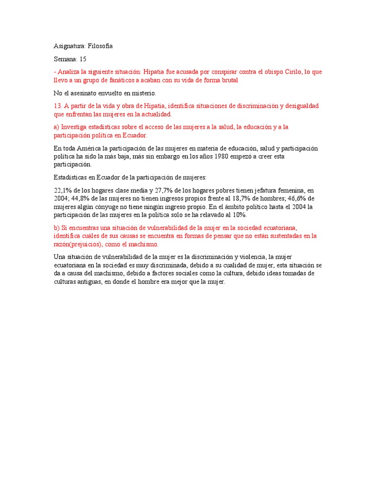 13. A partir de la vida y obra de Hipatia, identifica situaciones de discriminación y desigualdad