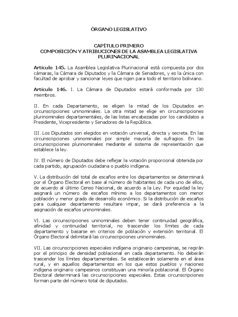 Artículo 145. La Asamblea Legislativa Plurinacional está compuesta por dos