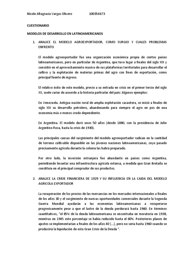 1. ANALICE EL MODELO AGROEXPORTADOR, COMO SURGIO Y CUALES PROBLEMAS