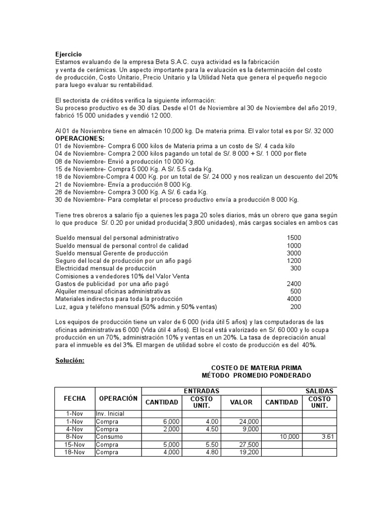 Al 01 de Noviembre tiene en almacén 10,000 kg. De materia prima. El valor total es por S/. 32 000