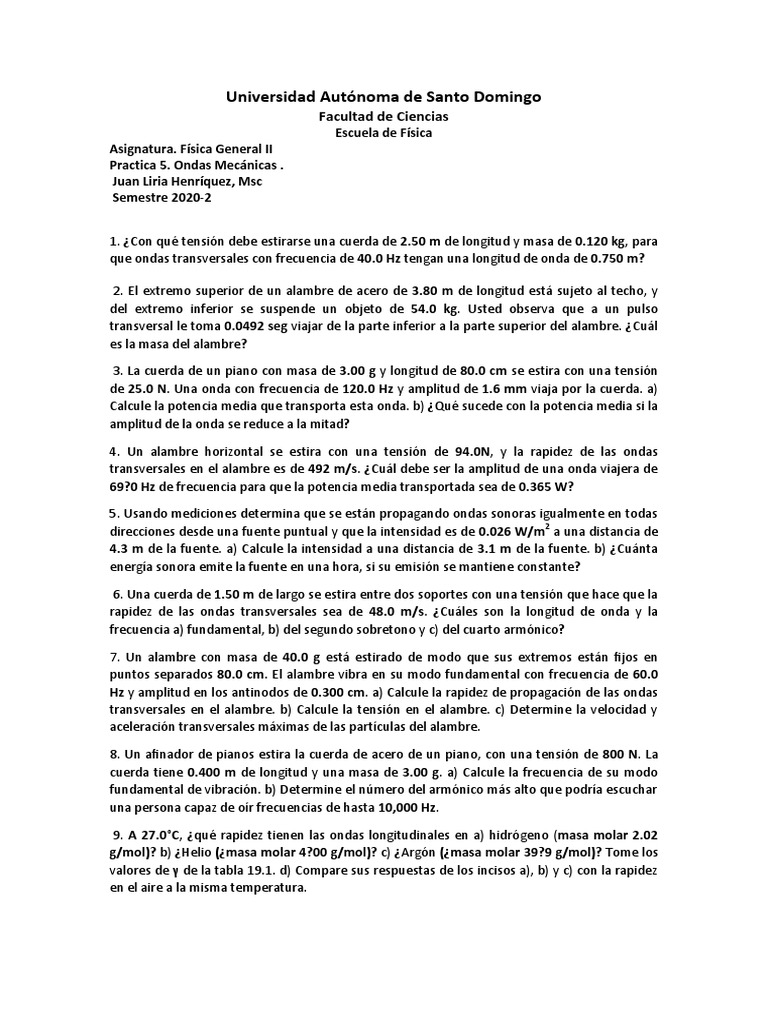 1. ¿Con qué tensión debe estirarse una cuerda de 2.50 m de longitud y masa de 0.120 kg, para