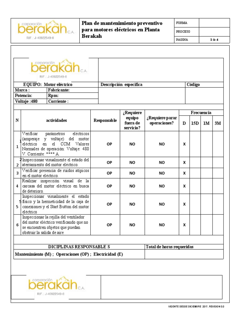 EQUIPO: Motor eléctrico Descripción especifica Código