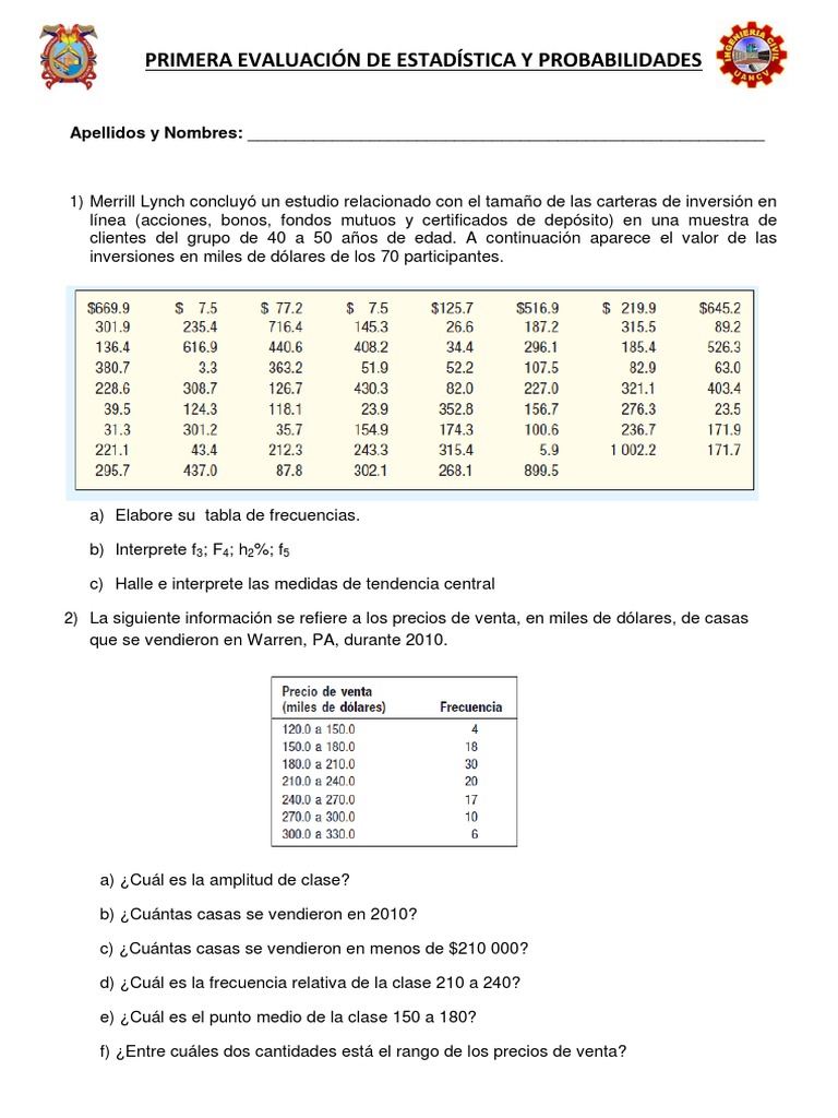 2) La siguiente información se refiere a los precios de venta, en miles de dólares, de casas
