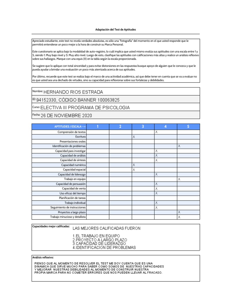 5, siendo 1: Muy bajo nivel y 5: Muy alto nivel. Luego de esto, clasifique las aptitudes con calificaciones más altas y realice un análisis reflexivo
