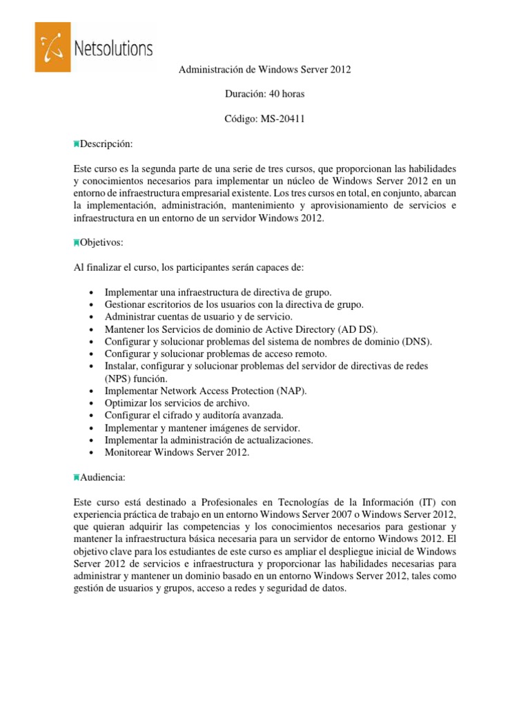 Este curso lo prepara para el examen:70-411: Administering Windows Server 2012. Este