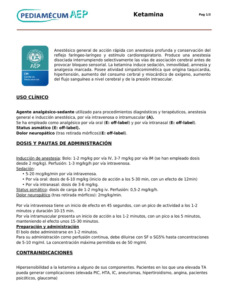 desde 2 mg/kg). Perfusión: 1-3 mg/kg/h por vía intravenosa.