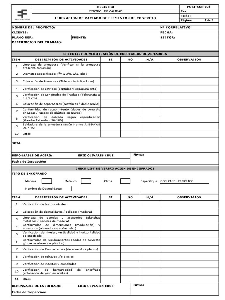 REPONSABLE DE ENCOFRADO: ERIK OLIVARES CRUZ Firma: