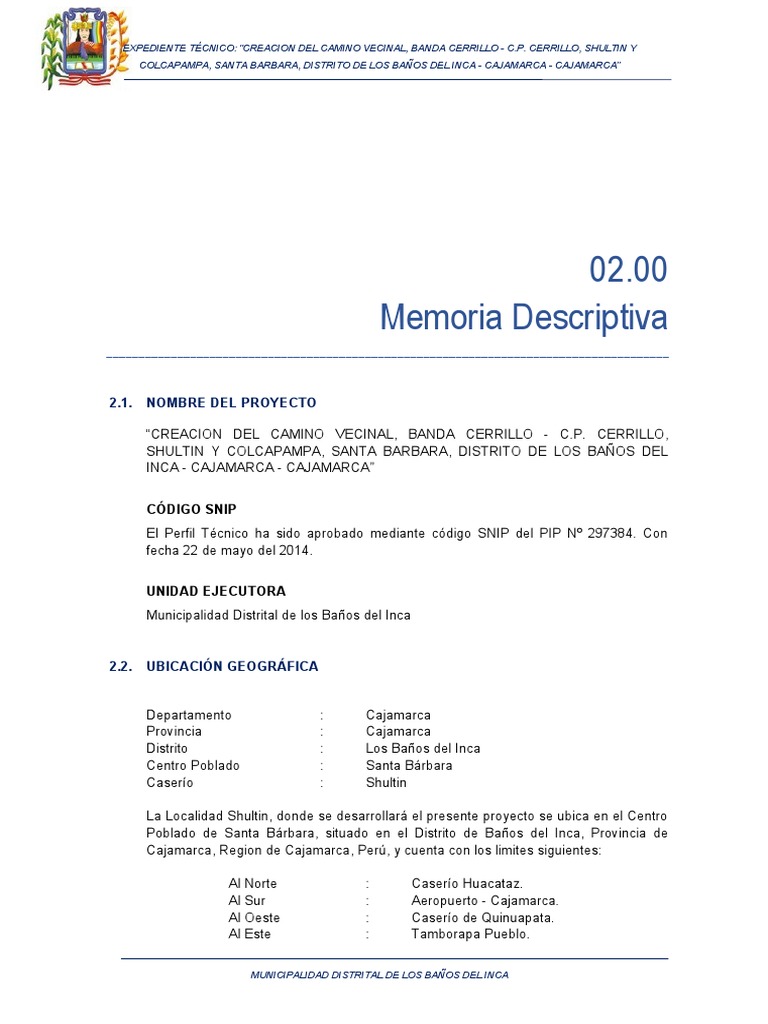 EXPEDIENTE TÉCNICO: “CREACION DEL CAMINO VECINAL, BANDA CERRILLO - C.P. CERRILLO, SHULTIN Y