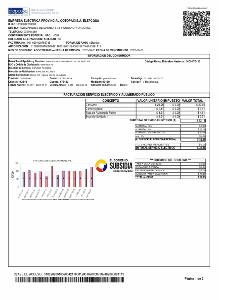 MES DE CONSUMO: AGOSTO/2020 --- FECHA DE EMISIÓN : 2020-08-31 FECHA DE VENCIMIENTO : 2020-09-20
