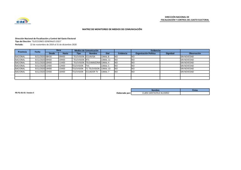 NACIONAL 9/12/2020 11H00 12H00 TELEVISION TVC CANAL 5 NO NO - SIN NOVEDAD
