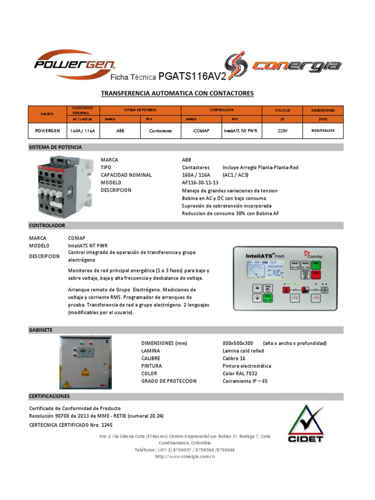 POWERGEN 160A / 116A ABB Contactores COMAP InteliATS NT PWR 220V 800x500x300