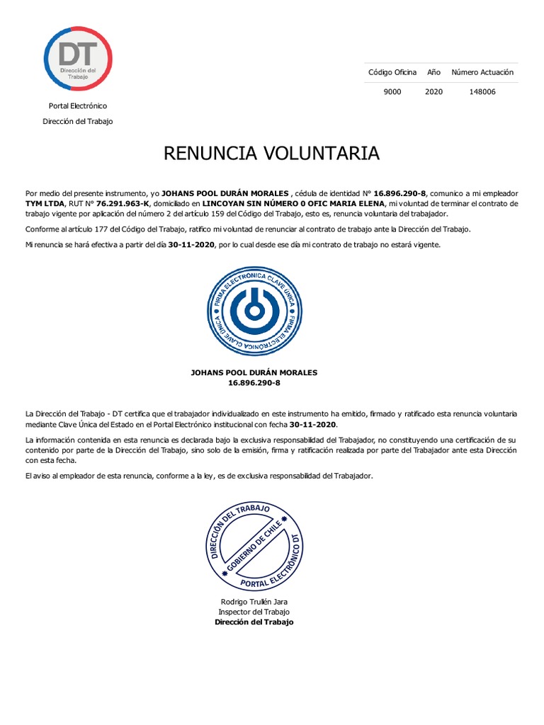 La Dirección del Trabajo - DT certifica que el trabajador individualizado en este instrumento ha emitido, firmado y ratificado esta renuncia voluntaria