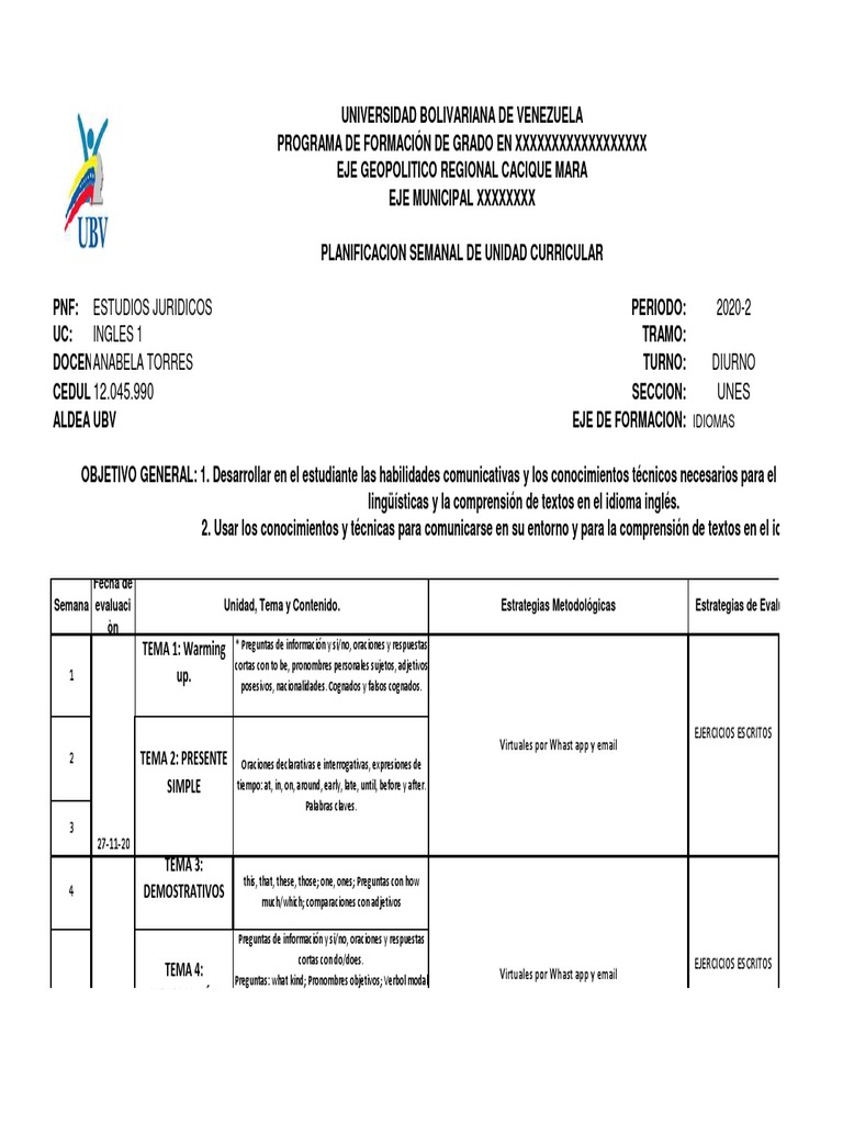 PLANIFICACION SEMANAL DE UNIDAD CURRICULAR
