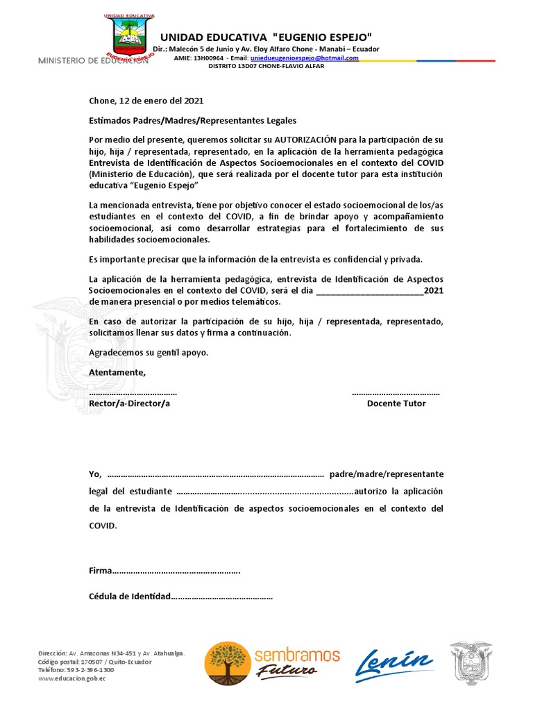 La mencionada entrevista, tiene por objetivo conocer el estado socioemocional de los/as