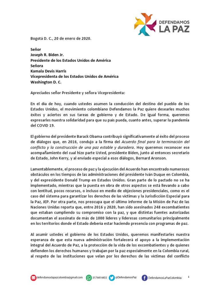 Estados Unidos, el movimiento colombiano Defendamos la Paz quiere desearles muchos