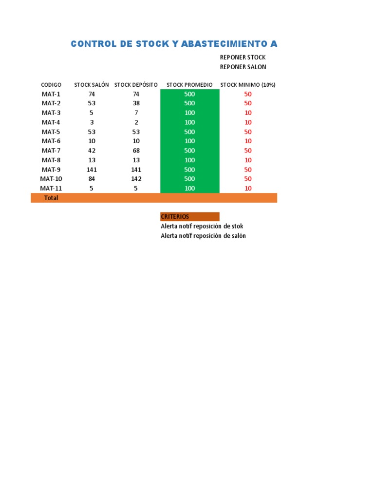CODIGO STOCK SALÓN STOCK DEPÓSITO STOCK PROMEDIO STOCK MINIMO (10%)