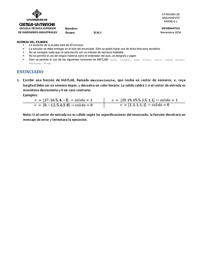 • Solo se permite el uso de las siguientes funciones de MATLAB: size, length, rem, floor, ceil, rand, error,