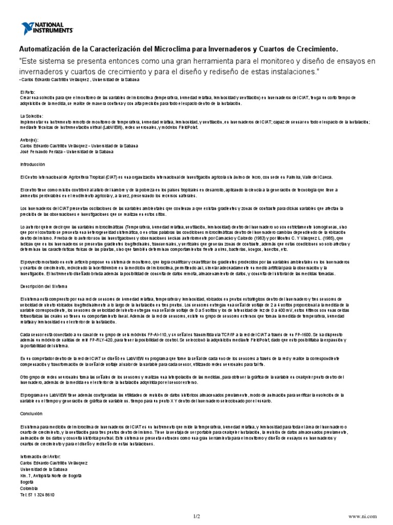 Este caso de estudio (este "caso de estudio") fue desarrollado por un cliente de National Instruments ("NI"). ESTE CASO DE ESTUDIO ES PROPORCIONADO "COMO ES" SIN GARANTÍA DE