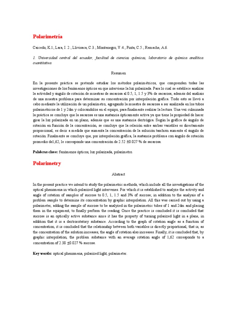 Para la presente práctica se utilizó un polarímetro, precisión y exactitud aceptables”[ 4 ] . Lo mismo se