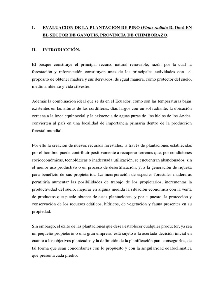 I. EVALUACION DE LA PLANTACION DE PINO (Pinus radiata D.