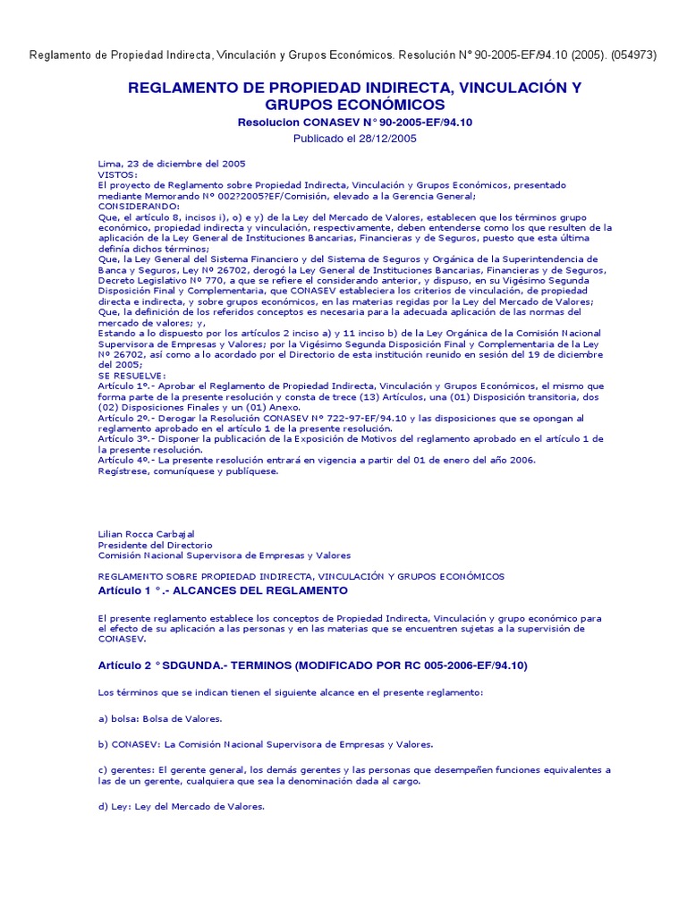 Reglamento de Propiedad Indirecta, Vinculación y Grupos Económicos. Resolución N° 90-2005-EF/94.10 (2005).