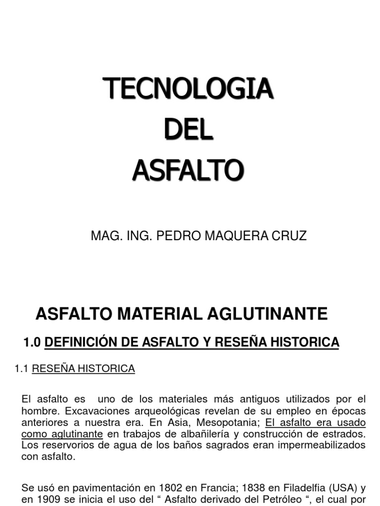 1.0 DEFINICIÓN DE ASFALTO Y RESEÑA HISTORICA