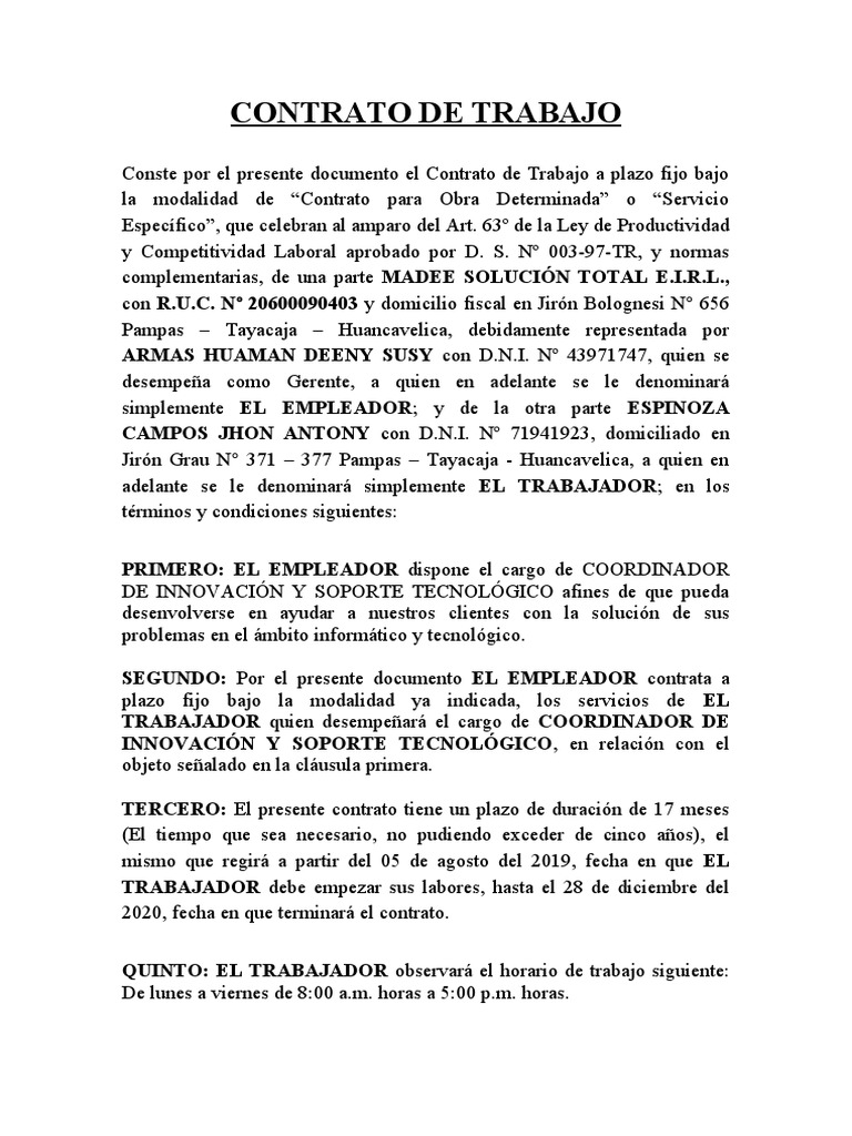 Conste por el presente documento el Contrato de Trabajo a plazo fijo bajo