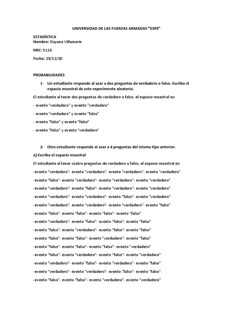 1- Un estudiante responde al azar a dos preguntas de verdadero o falso. Escriba el