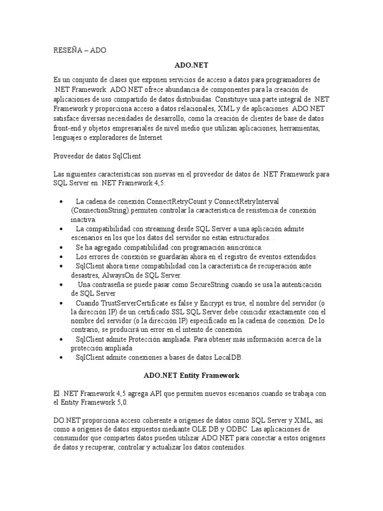 Framework y proporciona acceso a datos relacionales, XML y de aplicaciones. ADO.NET
