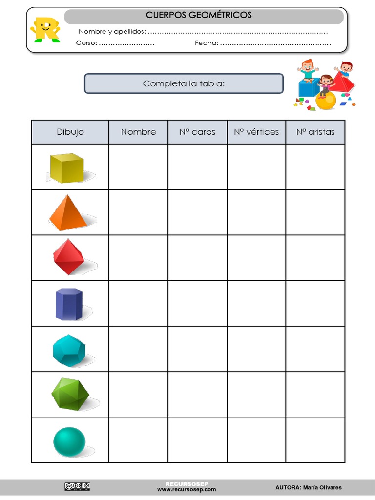 Este documento presenta una tabla para completar con información sobre cuerpos geométricos. La tabla incluye espacios para dibujar el cuerpo geométrico, anotar su nombre, y registrar el número de caras, vértices y aristas de cada figura. El documento fue creado por María Olivares del sitio web www.recursosep.com.