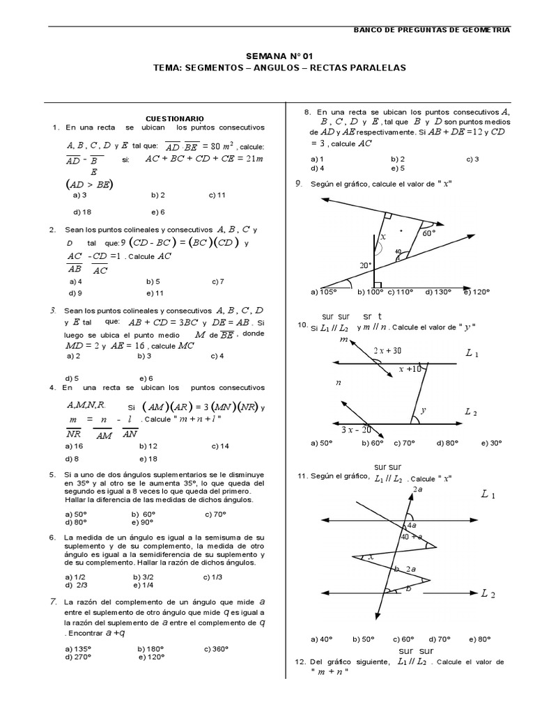 Semana No 01: SEGMENTOS – ANGULOS – RECTAS PARALELAS