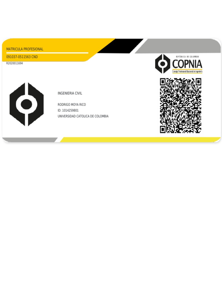 Este documento es un certificado de matrícula profesional que certifica que Rodrigo Moya Rico, identificado con cédula de ciudadanía 1014259801, se graduó de Ingeniero Civil en la Universidad Católica de Colombia y fue matriculado bajo el número 091037-0511563 CND con registro R2020011694.