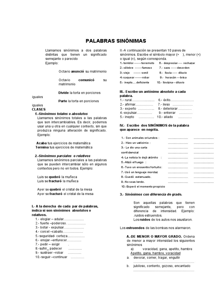 usar una u otra en cualquier contexto, sin que IV.- Escribe dos SINÓNIMOS de la palabra
