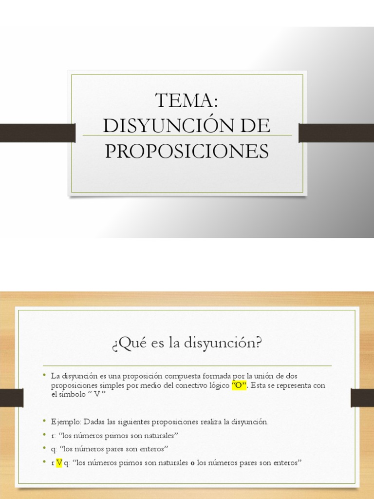 • La disyunción es una proposición compuesta formada por la unión de dos