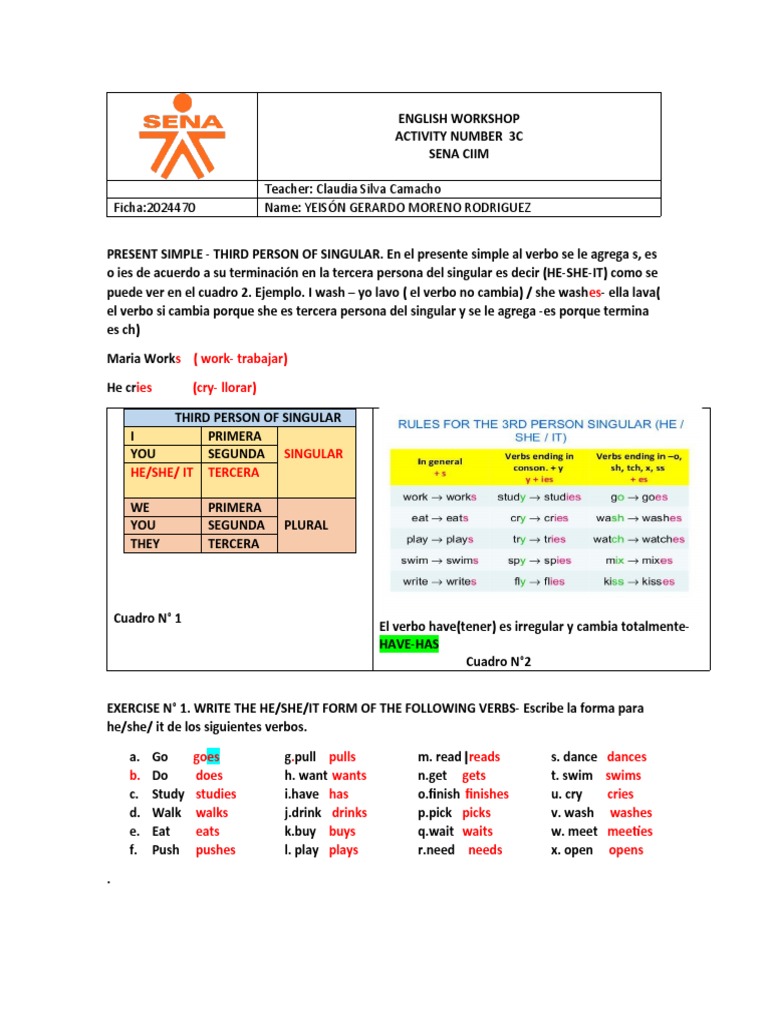 EXERCISE N° 1. WRITE THE HE/SHE/IT FORM OF THE FOLLOWING VERBS- Escribe la forma para
