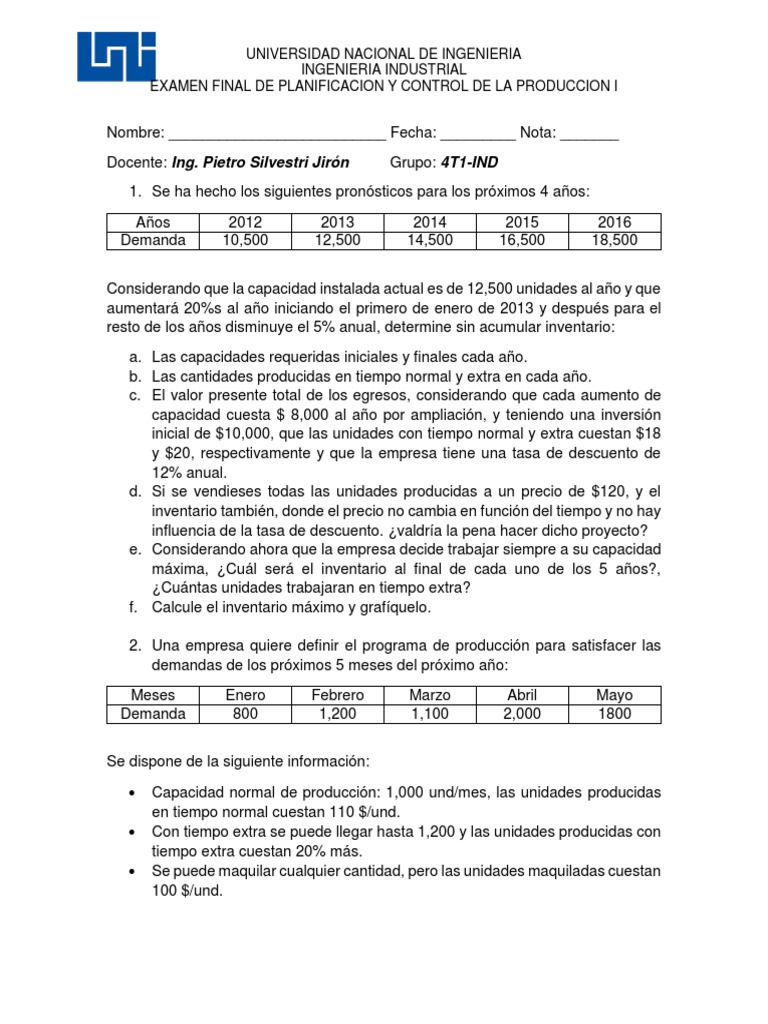 EXAMEN FINAL DE PLANIFICACION Y CONTROL DE LA PRODUCCION I