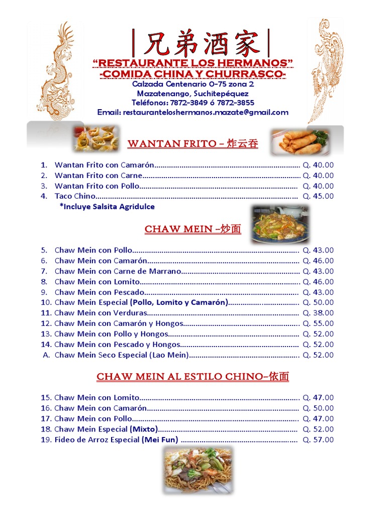 10. Chaw Mein Especial (Pollo, Lomito y Camarón)……………..…………….. Q. 50.00