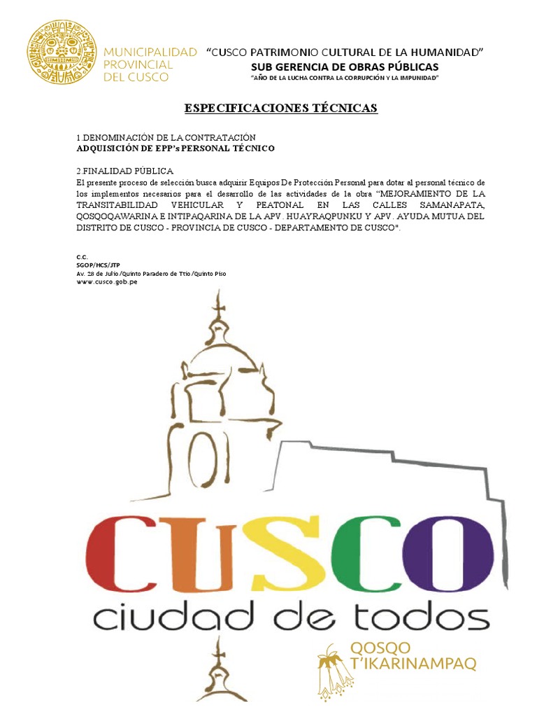 CUSCO”, de acuerdo a lo indicado por el Residente de Obra; en horario de 07:00hrs a 12:00 hrs y de 13:00hrs a