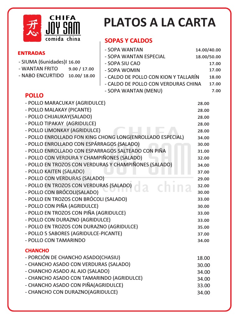 - CHAUFA JOY SAM (PORCIÓN) 15.00 - AEROPUERTO JOY SAM (ESPECIAL) 35.00