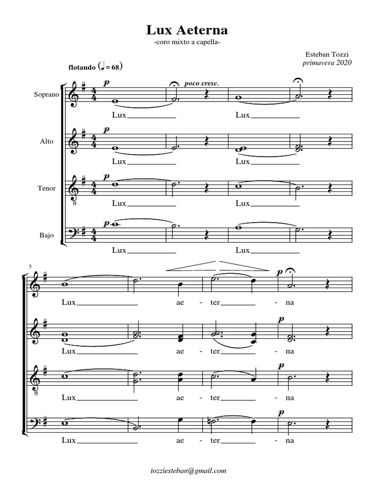 El documento es la partitura para coro mixto a capella titulada "Lux Aeterna" compuesta por Esteban Tozzi. La partitura contiene las líneas melódicas y armónicas para cada voz del coro (soprano, alto, tenor y bajo) divididas en secciones musicales. La obra musical explora temas de luz eterna y paz para los fieles difuntos.